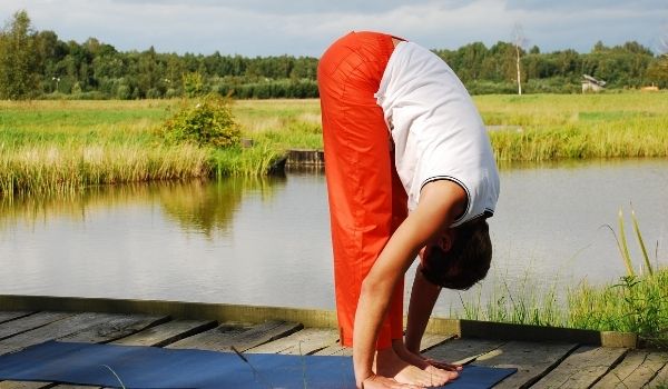 10. Hastapadasana (bend pose with hand touching floor)